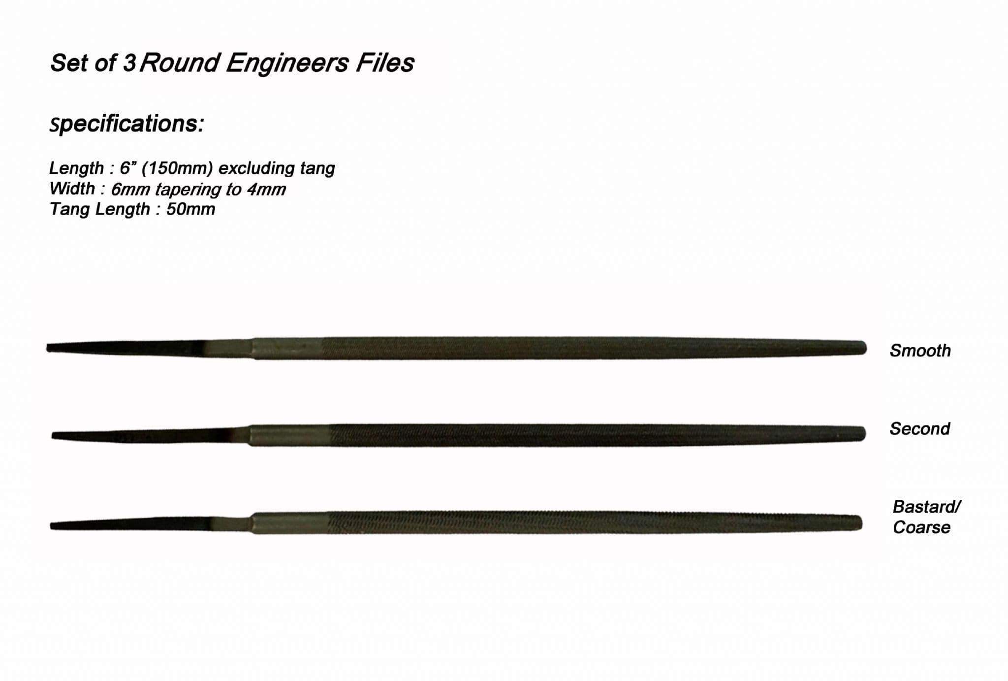 Engineers Files, Set of 3, 6" 150mm, Round Smooth, Second, Bastard Coarse Files. F9970